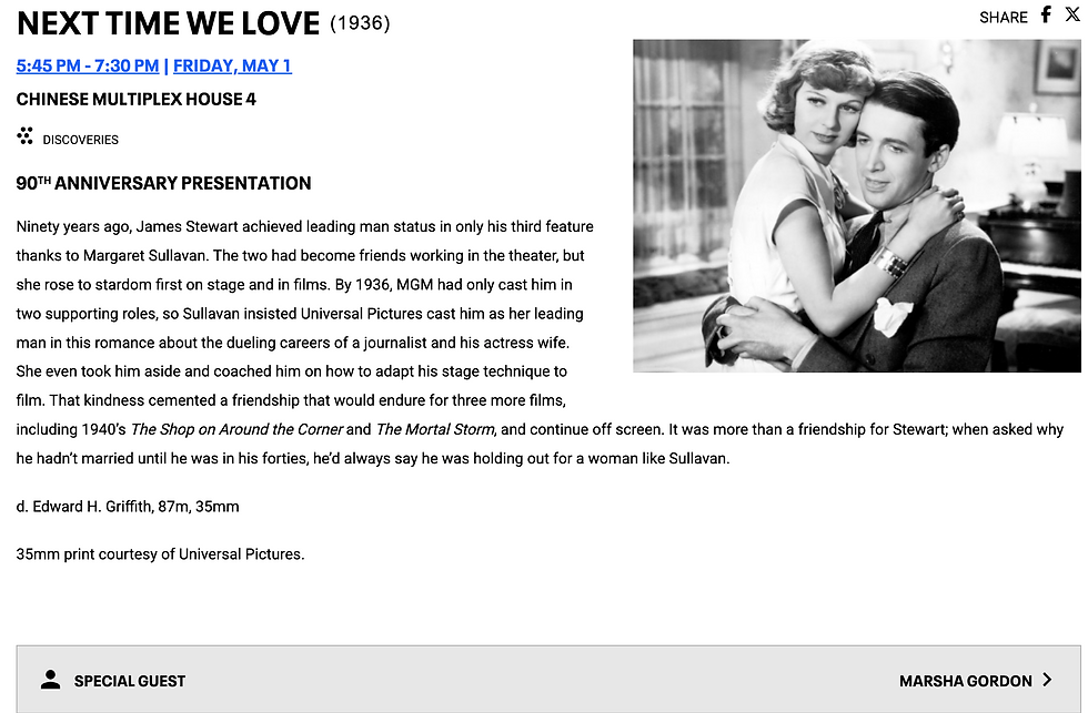I'm introducing another Ursula Parrott adaptation at the 2026 TCM Festival in Hollywood on May 1, 2026. "Next Time We Love" is a rarely seen gem starring Jimmy Stewart in his first leading role and an immensely charming Margaret Sullavan. The festival will be showing a gorgeous 35mm print from Universal Archives, too! The festival is also showing "There's Always Tomorrow," so there will be two Parrott adaptations at the festival this year.
